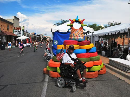 The sculpture was composed of 67 tires arranged in concentric circles that became smaller as it approached the top of the structure like a pyramid. This sculpture also featured 8 levels that were painted specific colors to reference color compositions found in the landscape of New Mexico. These colors reference the colors found in the land and the sunsets of New Mexico. The color scheme is also meant to represent the idea that this location (New Mexico) is a “kaleidoscope of color” that inspires creative activity and attracts artists from all over the globe. These colors also illustrate the oftentimes surprising subtle and complex color schemes found in this high desert climate that is stereotypically thought of as a baron, dull and uninteresting.